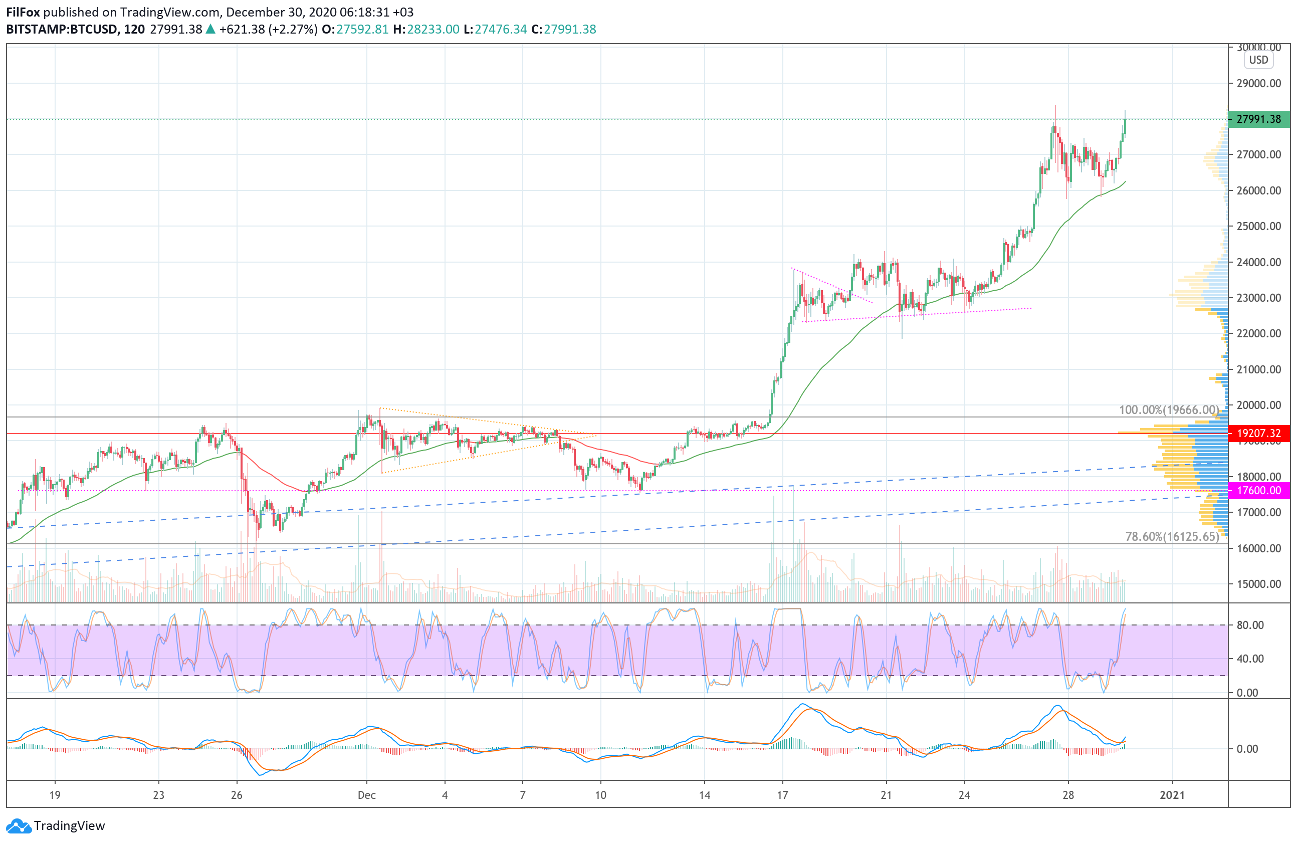 Сегодня пара может протестировать отметку 29000.00 USD, а до конца года целевой отметкой быков, скорее всего, является уровень 30000.00 USD.