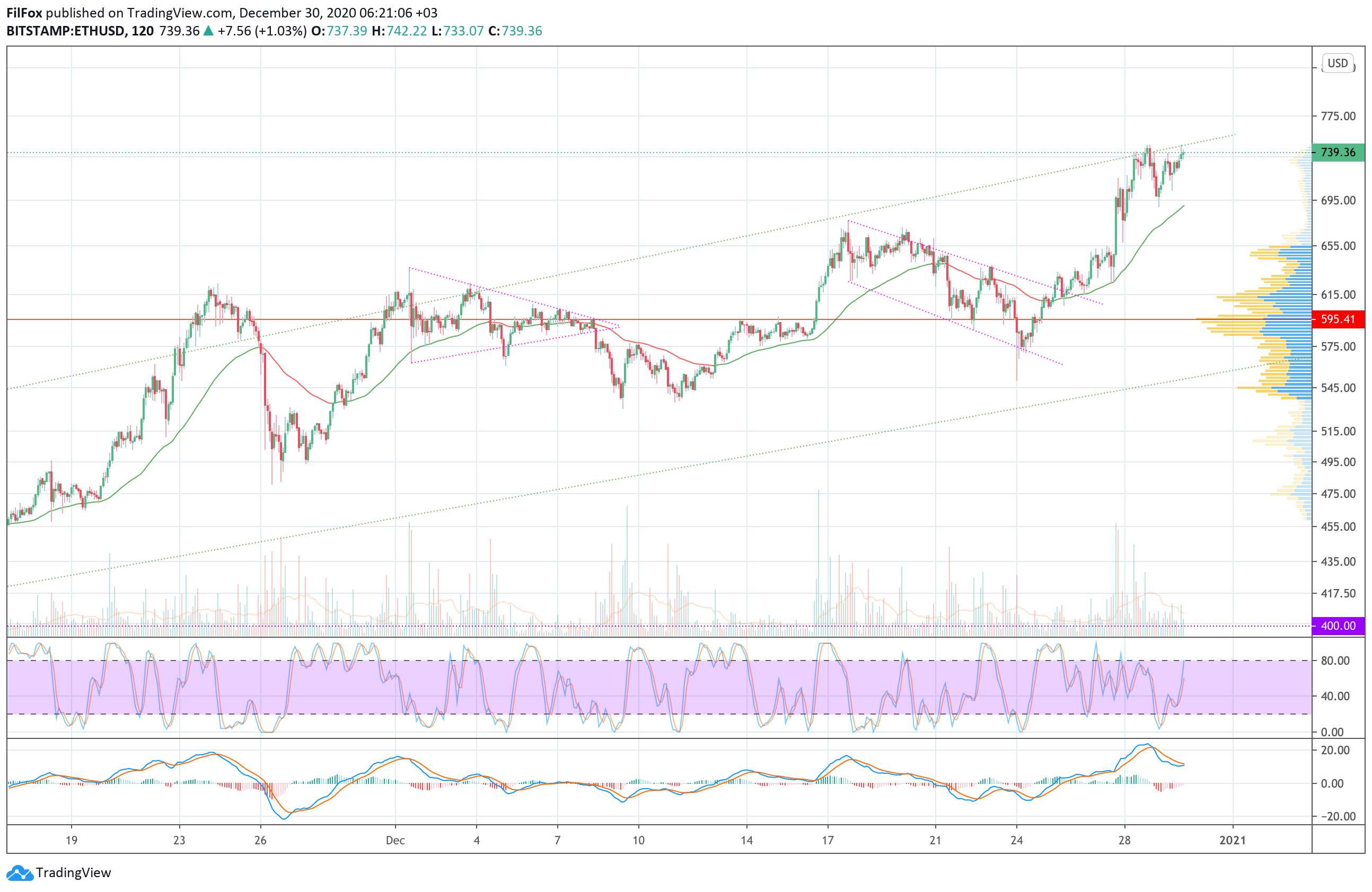 Цена Ethereum в начале этой недели протестировала верхнюю границу восходящего зелёного канала, обновив годовой максимум в точке 747.00 USD, но продавцы не позволили с первого раза прорвать сопротивление верхней линии тренда и откатили пару к отметке 700.00 USD.