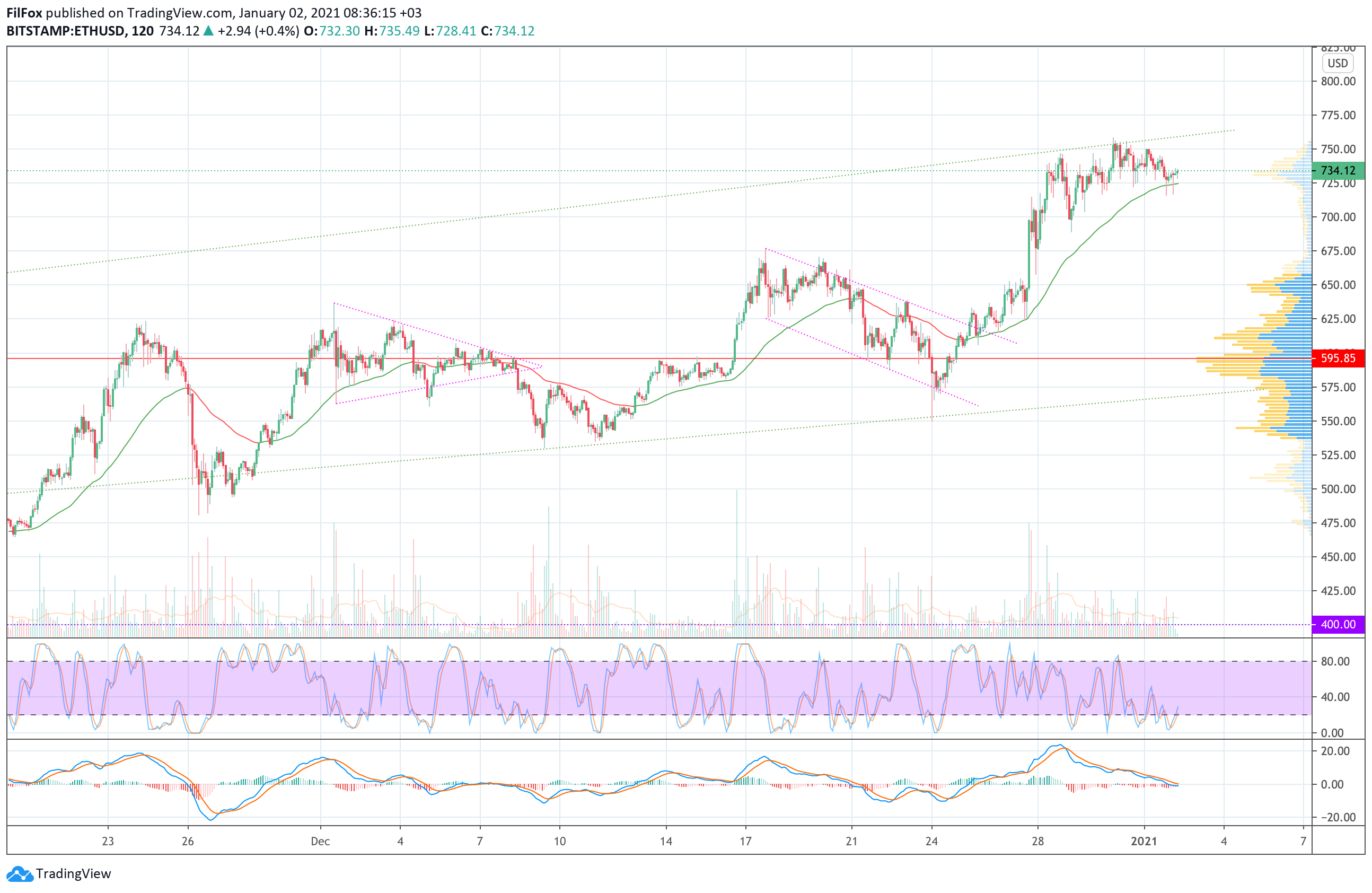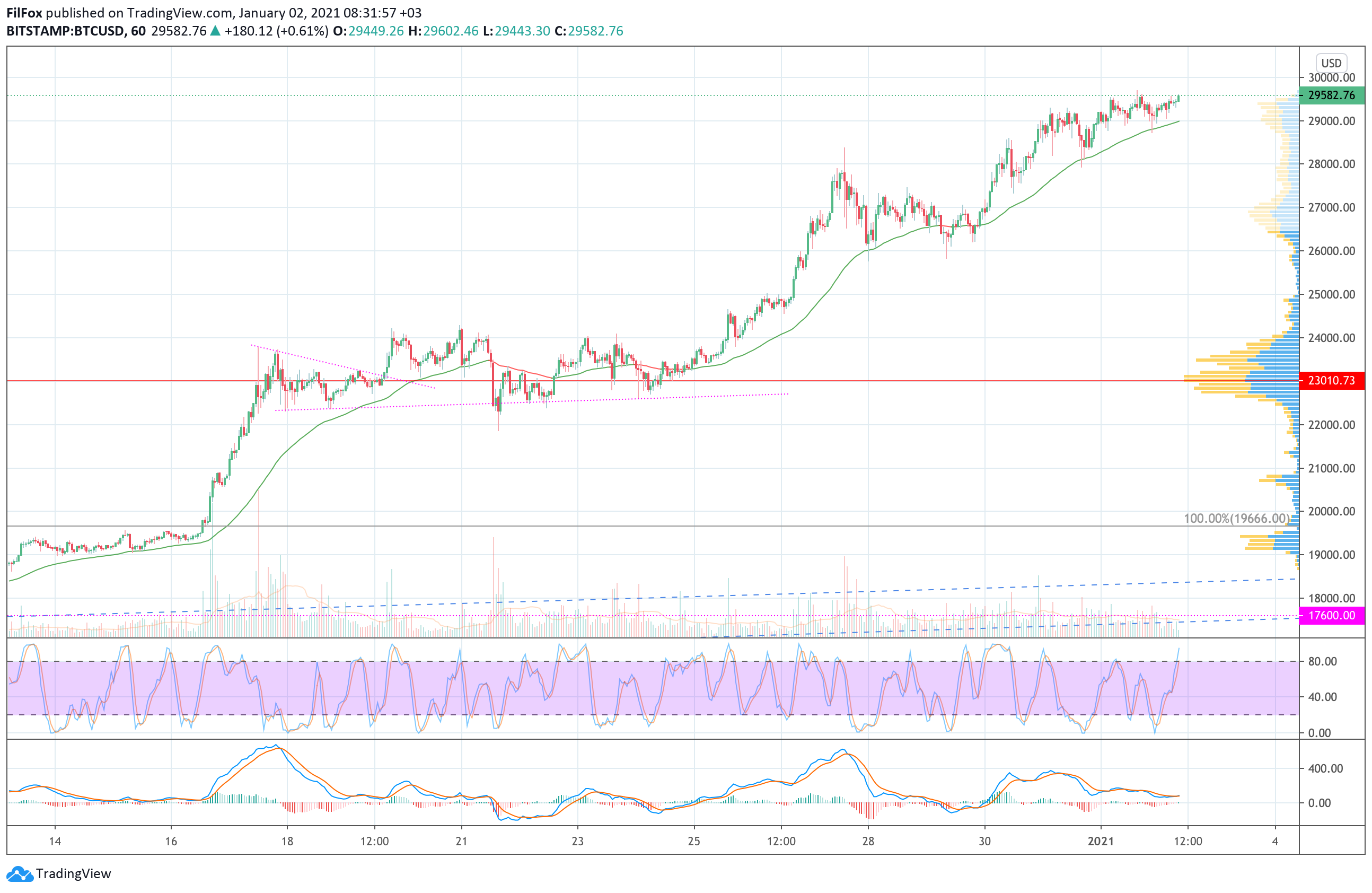 В первый день нового года цена BTC обновила максимум в точке 29700.00 USD и откатилась в область часовой EMA55. Эта скользящая средняя удержала пару от дальнейшего снижения и сегодня ночью цена полностью восстановилась в зону вчерашнего максимума.