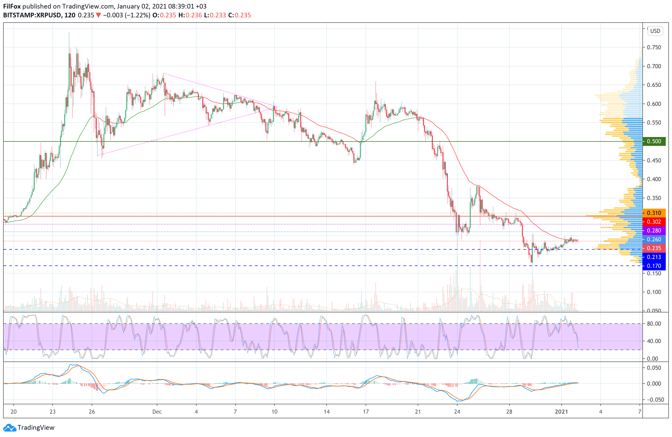 Вчера утром двухчасовая скользящая средняя EMA55 сдерживала восстановительную динамику цены Ripple и пара увязла в очень узком боковике на уровне средних цен.