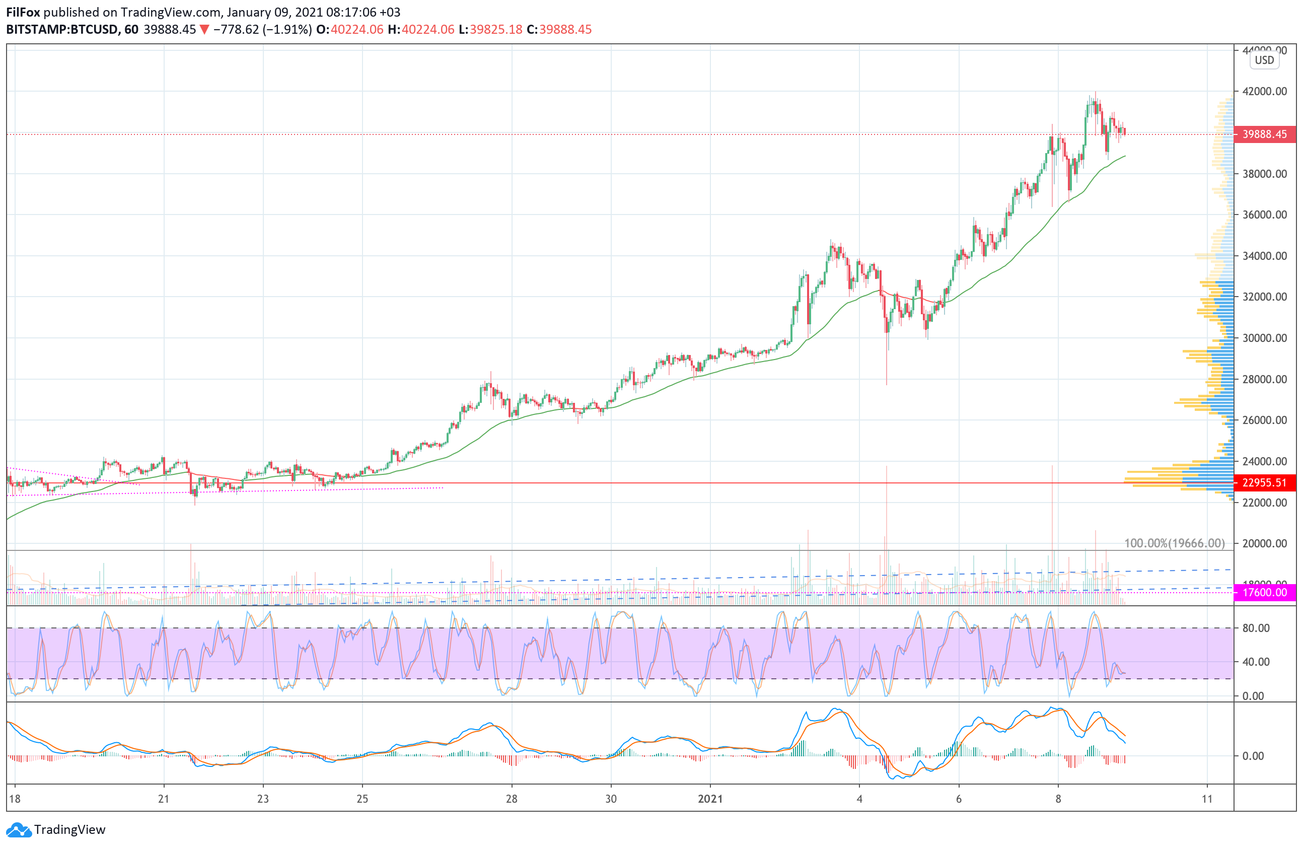 Вчера, рано утром, цена BTC откатилась к уровню часовой EMA55, и нащупав там поддержку, покупатели принялись восстанавливать цену в зону январского максимума. К середине дня объёмы покупок позволили преодолеть сорокатысячный рубеж и продолжить бычий забег.