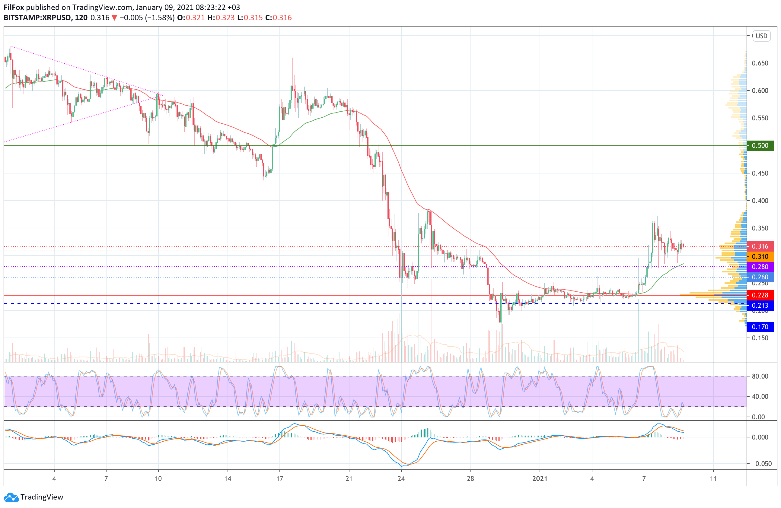 Вчера покупатели прилагали немалые усилия, чтобы вытащить пару из бокового коридора $0.280 - $0.310. Днём им удалось протестировать уровень 0.345 USD, но к концу дня цена XRP всё равно откатилась к верхней границе бокового диапазона 0.310 USD.