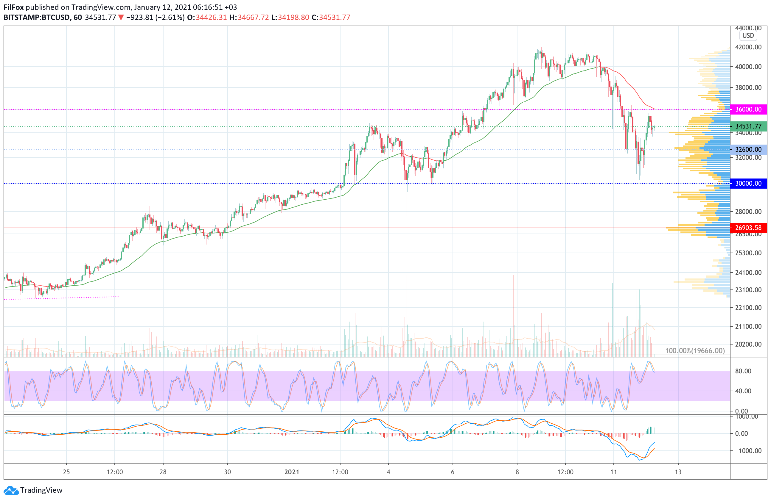 Сегодня ночью покупатели попытались продолжить восстановление в область средних цен, но до утра пара так и не смогла протестировать часовую EMA55, которая проходит на уровне 36000.00 USD.