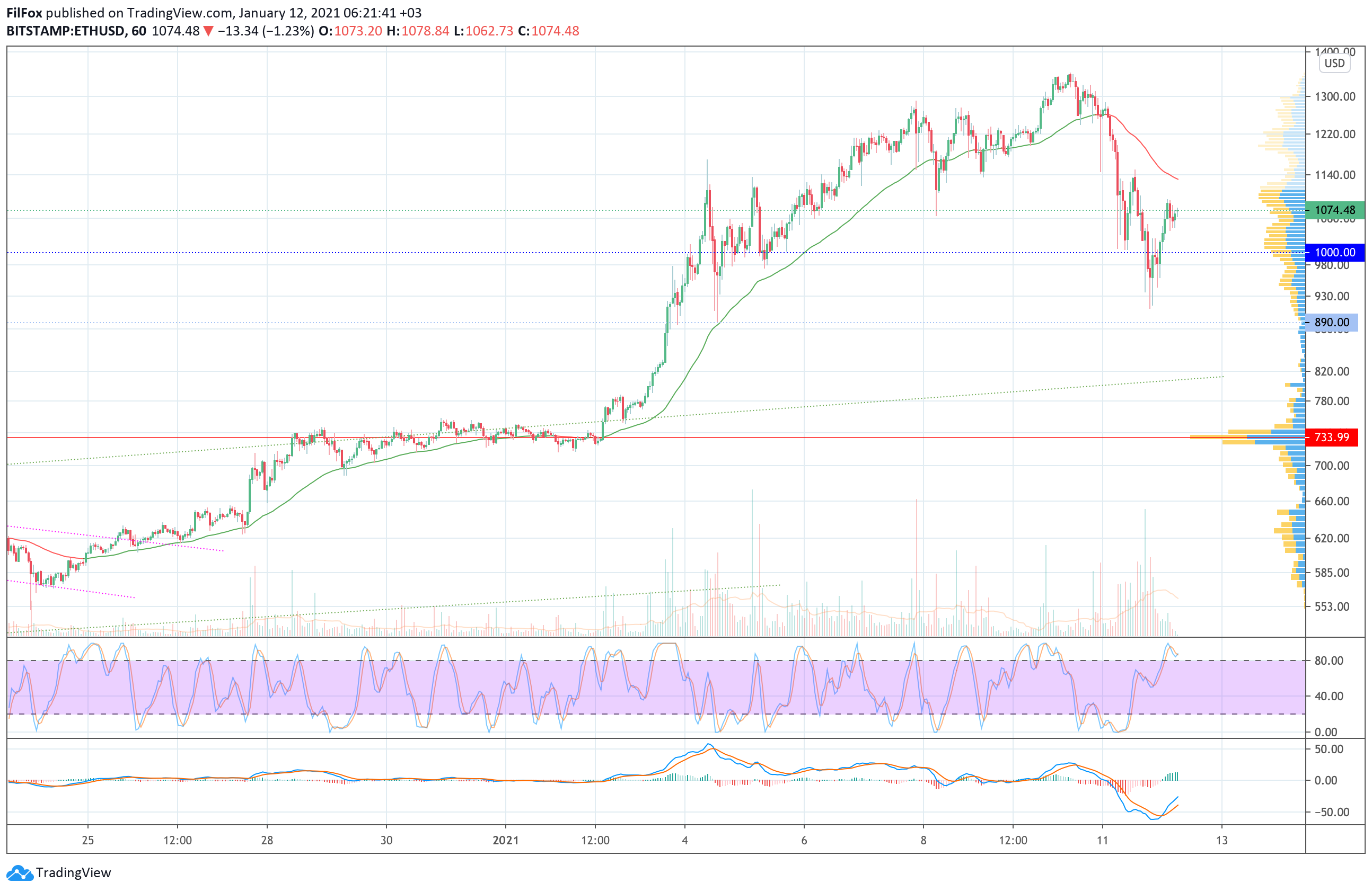 Вчера психологический рубеж 1000.00 USD не смог остановить падение цены эфира, и в течение дня снижение продолжалось к дневному минимуму в точке 911.00 USD. Когда медвежье давление прекратилось, цена отскочила выше отметки тысяча долларов и до сегодняшнего утра пытается нащупать поддержку в области 1050.00 USD.
