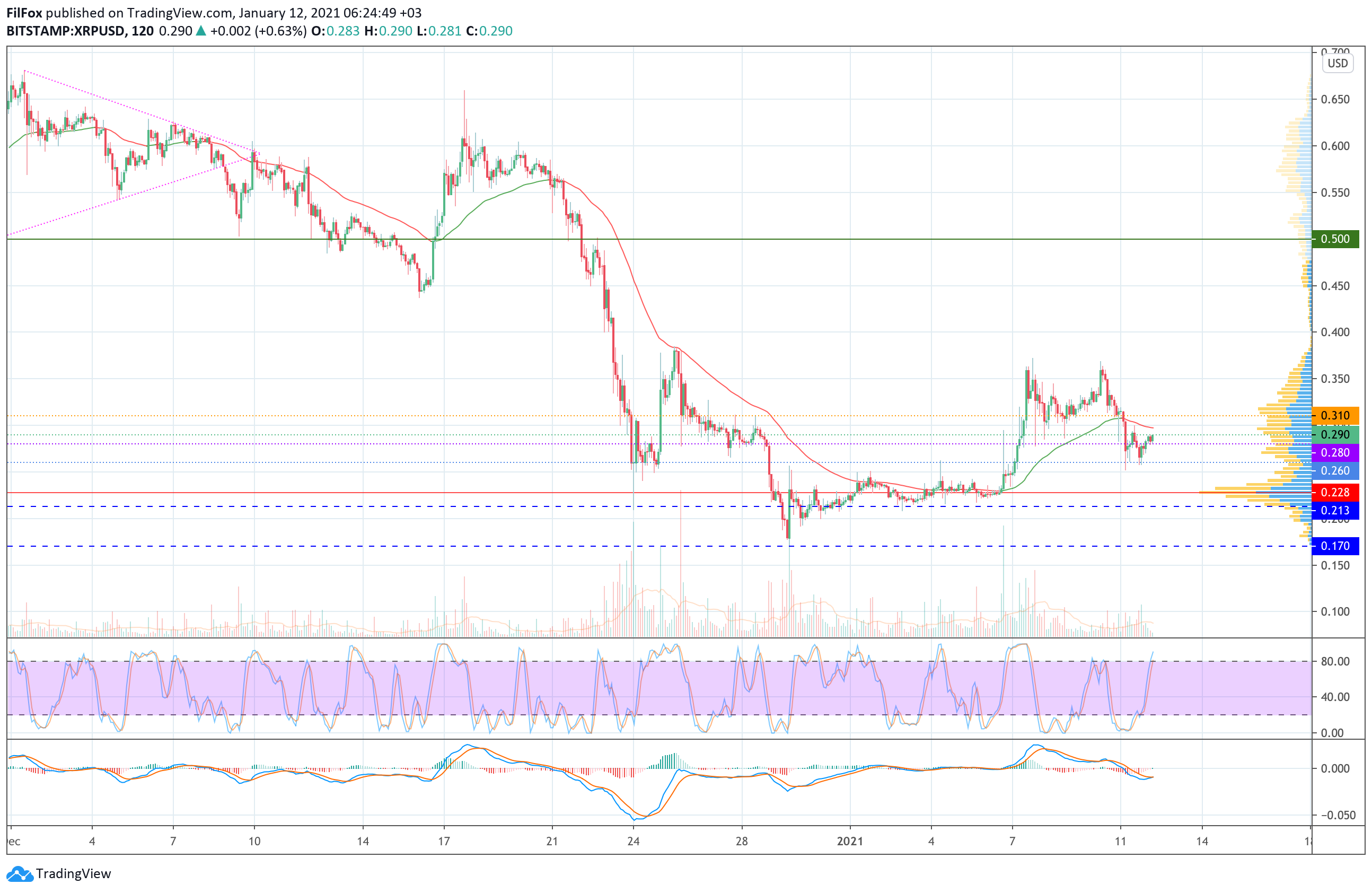 Вчера поддержка в районе отметки 0.260 USD остановила снижение цены Ripple и пара восстановилась над нижней границей бокового коридора 0.280 USD.