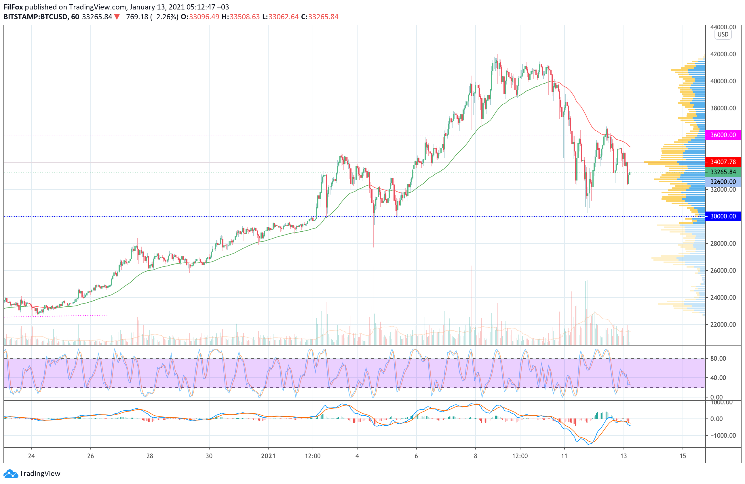 Если уровень средних цен по-прежнему будет сдерживать восстановительную динамику, то до выходных пара будет двигаться в боковом направлении, вдоль индикаторной линии Point Of Control (34007.78 USD).