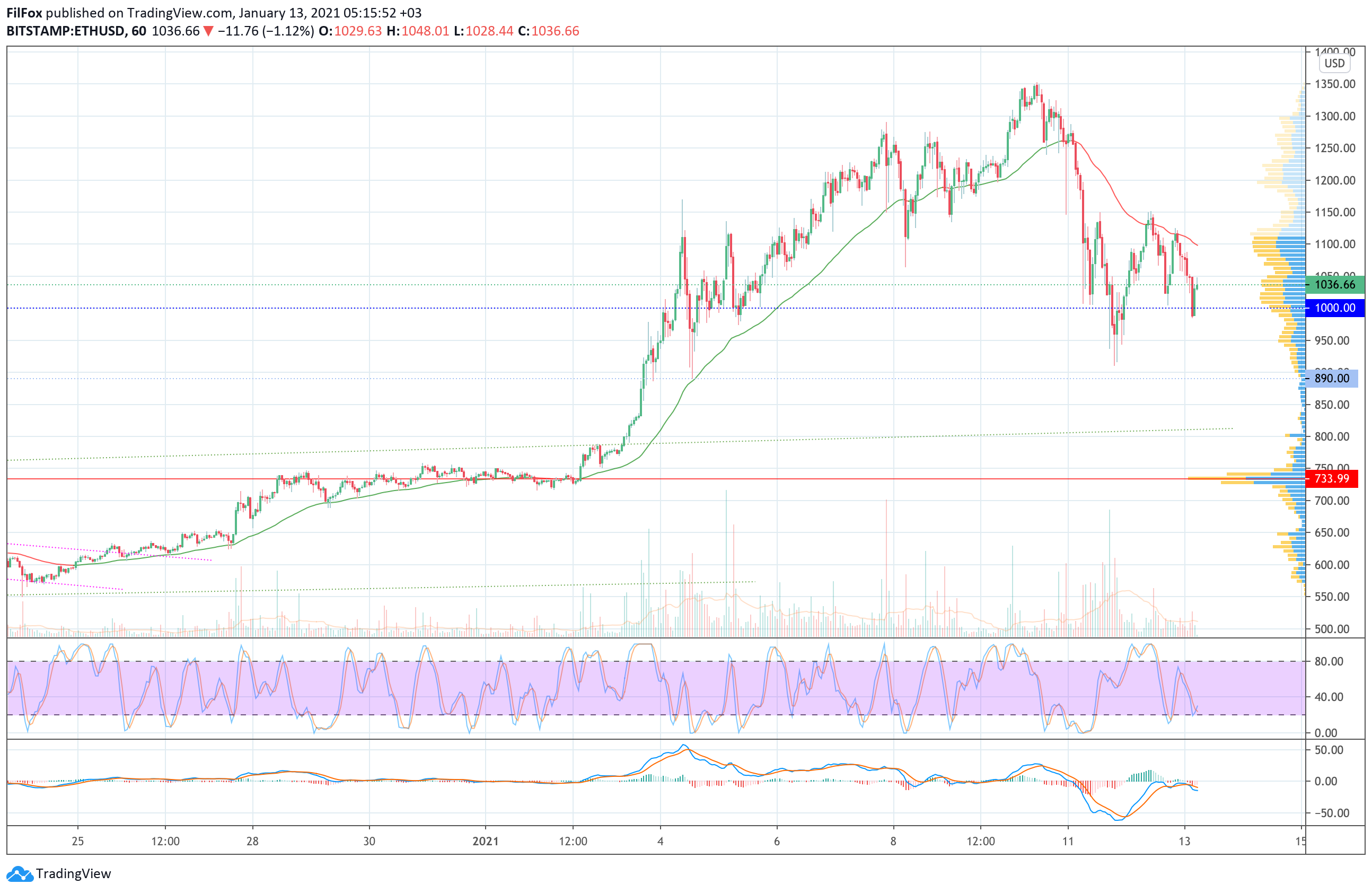 Вчера, в течение дня, покупатели два раза пытались преодолеть сопротивление часовой EMA55, но оба раза цена ETH откатывалась к поддержке на уровне 1000.00 USD. Торги по эфиру проходили на средних объёмах, и если сегодня такая тенденция сохранится, то движение в боковом направлении продолжится.