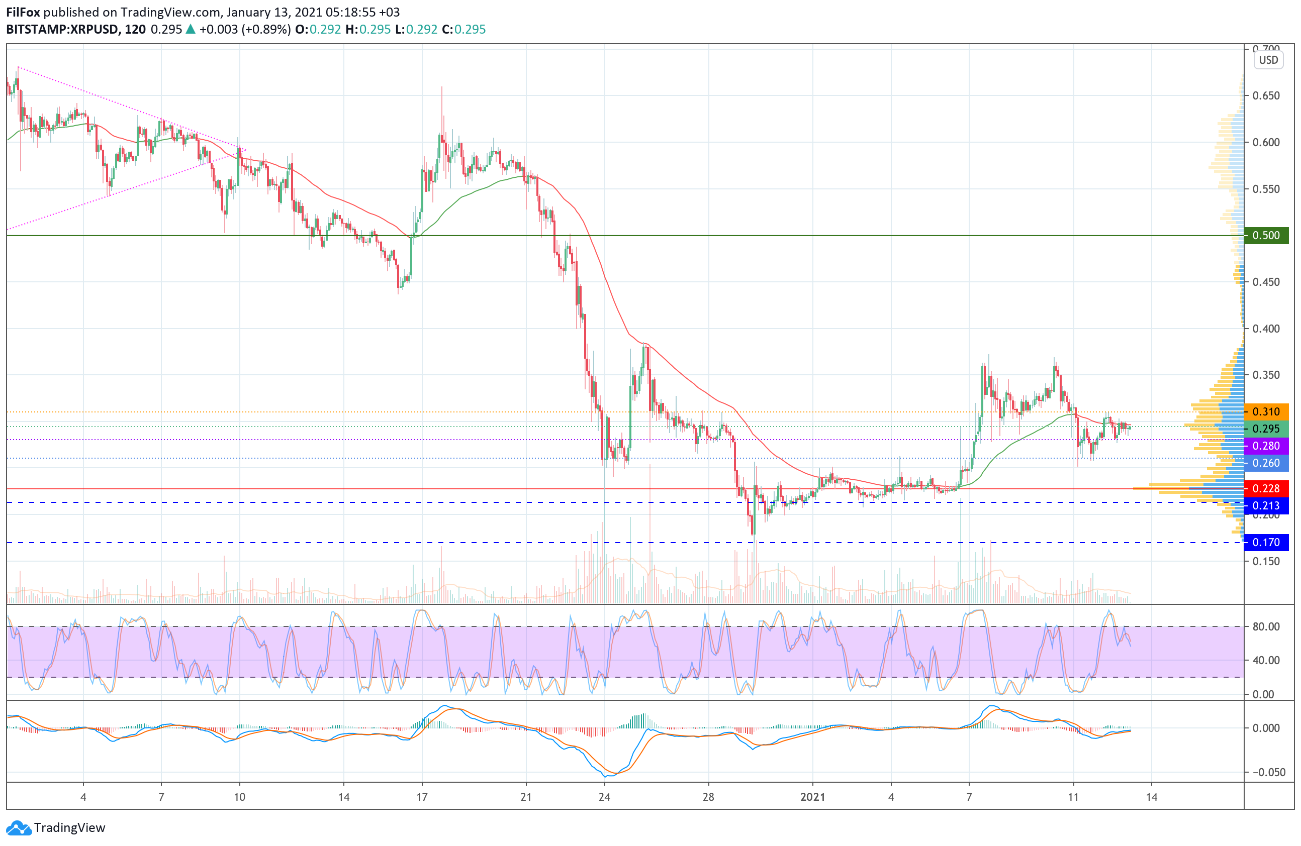 Вчера объёмы продаж были на низком уровне и цена XRP смогла протестировать верхнюю границу бокового коридора 0.310 USD. Как мы и предполагали, пара осталась в консолидации, сужая диапазон к двухчасовой EMA55.