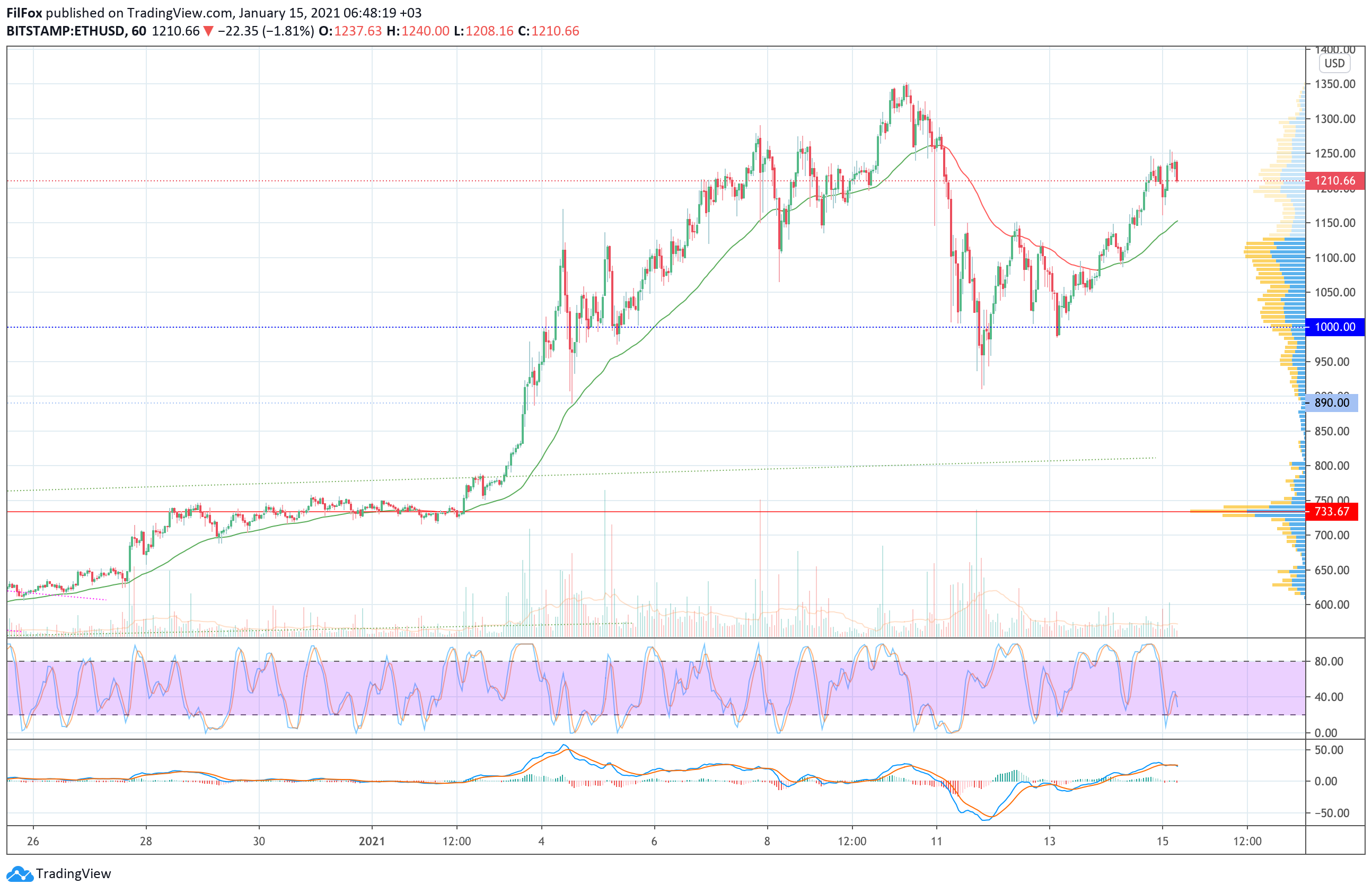 Вчера, в первой половине дня, часовая EMA55 остановила откат цены Ethereum, и восстановление пары продолжилось в район сопротивления 1200.00 USD. Вечером покупатели протестировали этот уровень, а сегодня ночью установили локальный максимум в точке 1255.00 USD.