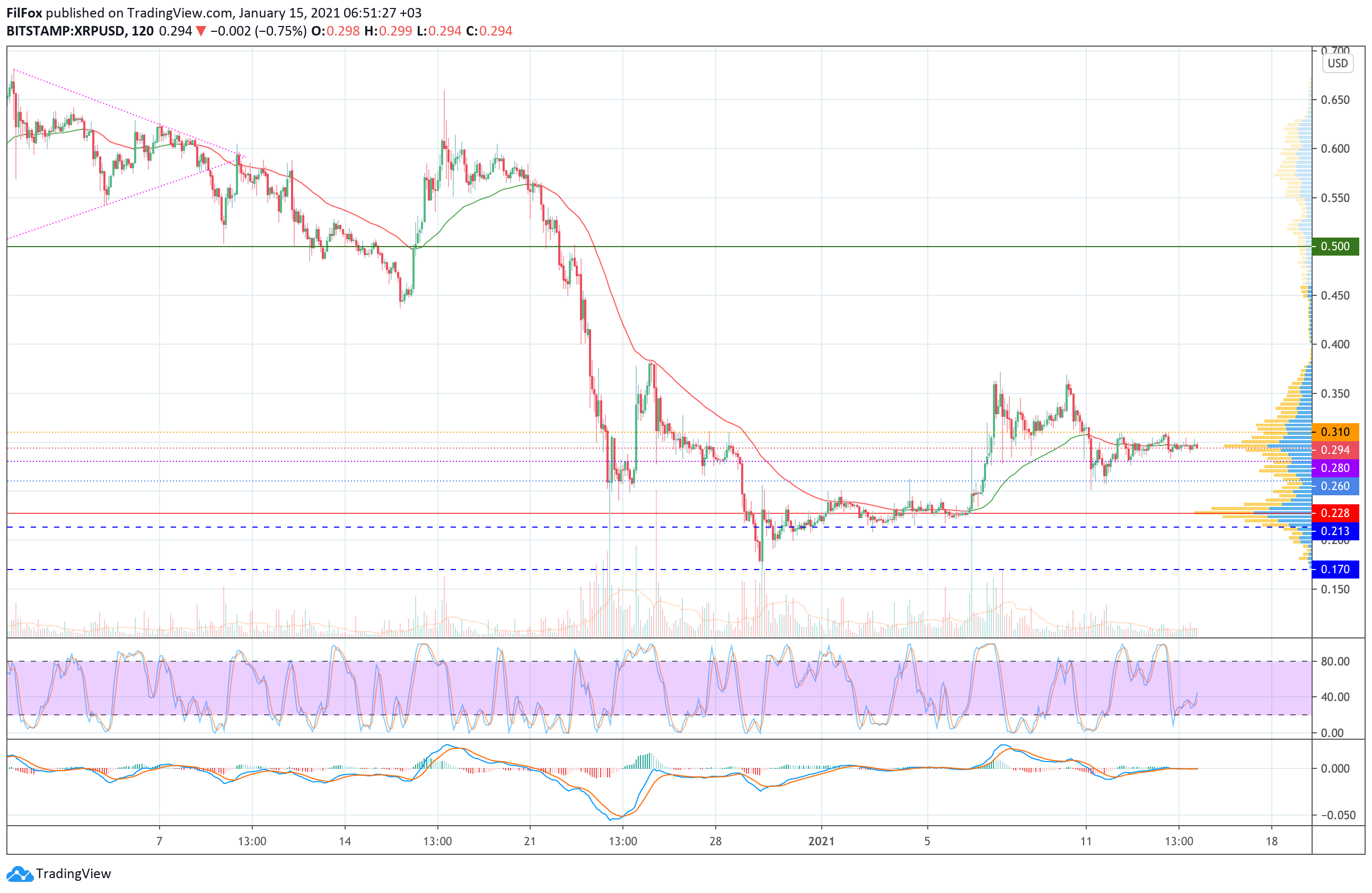 Если в завершении текущей недели криптовалютный флагман продолжит рост, то он сможет потянуть за собой цену Ripple. Тогда пара XRP/USD покинет боковой диапазон, ограниченный сильным сопротивлением на уровне 0.310 USD, и протестирует отметку 0.340 USD.