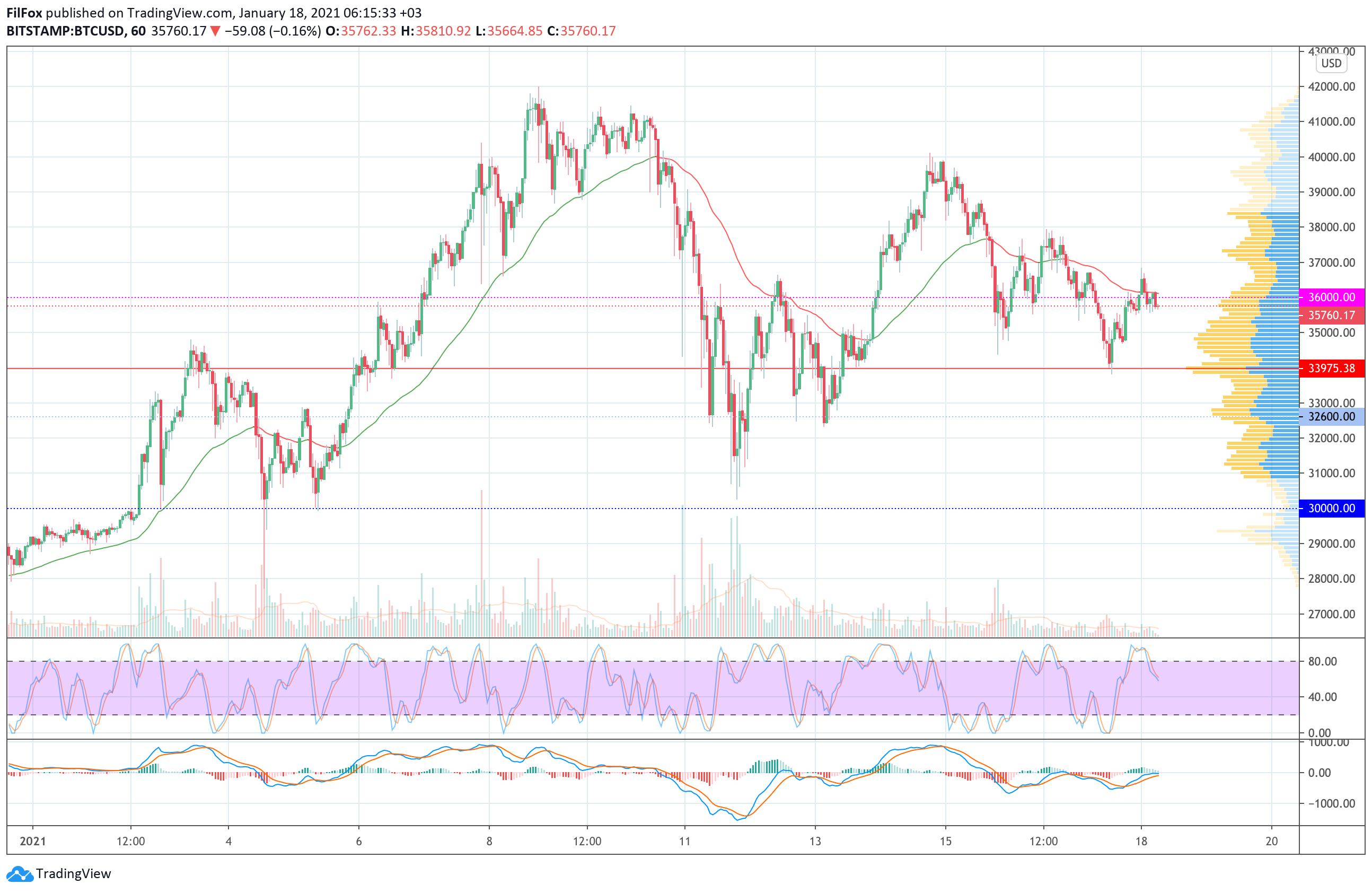 На минувших выходных медведи продавили поддержку 36000.00 USD и протестировали уровень 34000.00 USD. Вчера, во второй половине дня, покупатели попытались восстановить цену, но не смогли удержаться выше часовой EMA55.