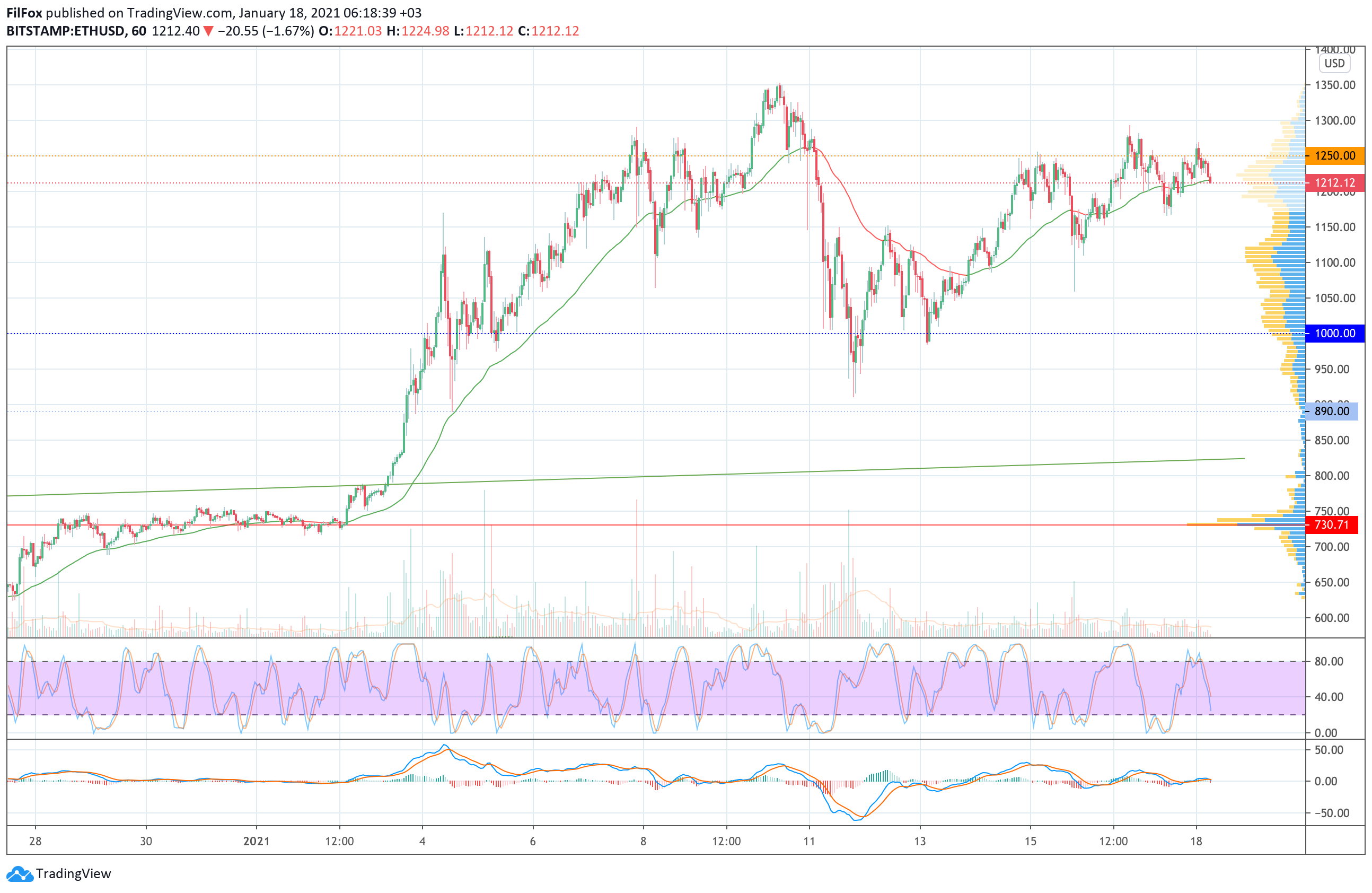 Сегодня ночью объёмы торгов сократились и пара пытается удержаться в области часовой EMA55, но на утро давление медведей может усилиться, тогда цена эфира протестирует уровень 1150.00 USD. Если медведи не смогут пробить поддержку 1120.00 USD, то в начале этой недели быки попытаются организовать полномасштабное восстановление в зону январских максимумов.