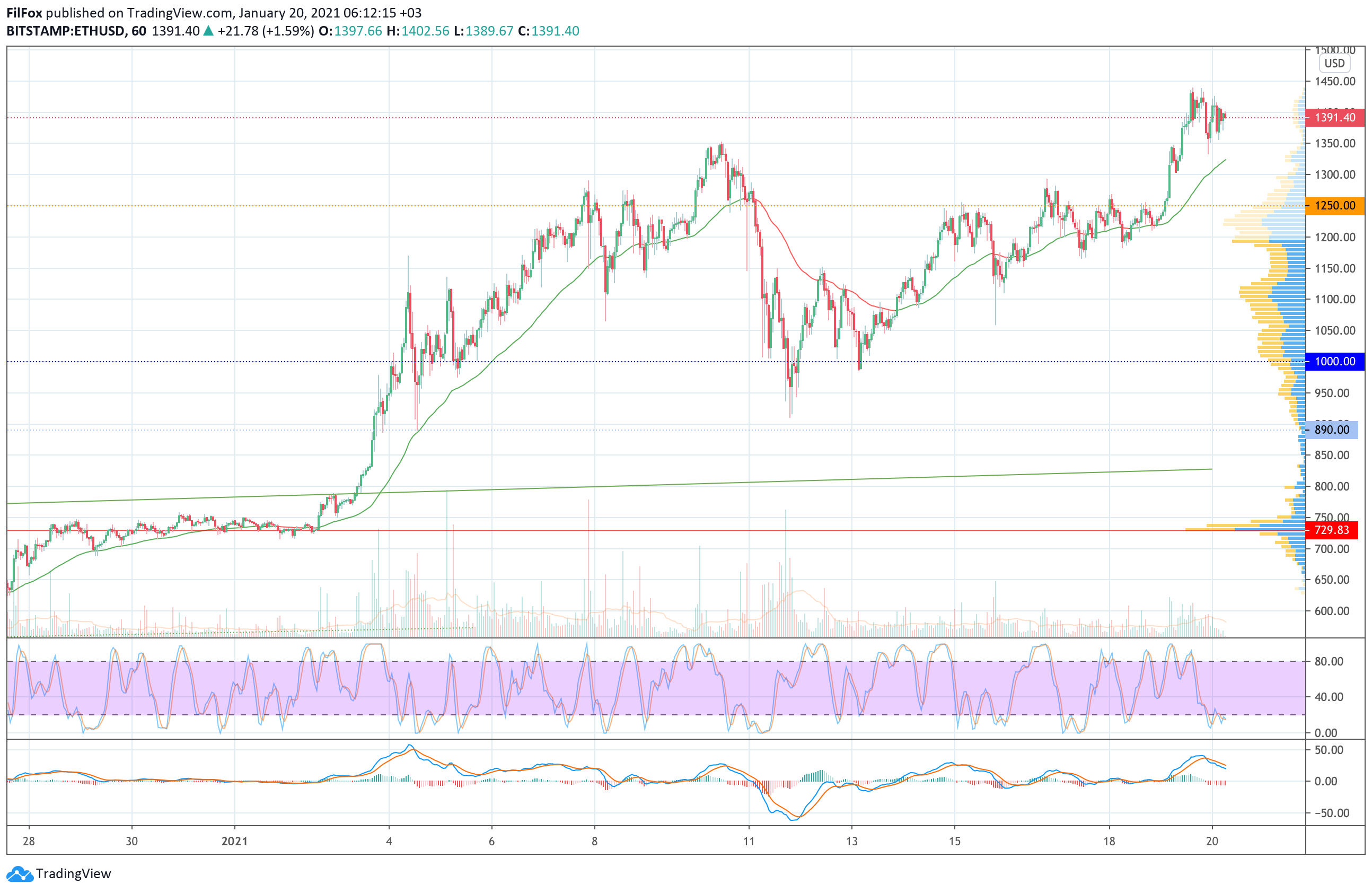 Цена Bitcoin не смогла закрепиться выше сопротивления 37300.00 USD, а цена Ethereum вчера обновила месячный максимум в точке 1440.00 USD.