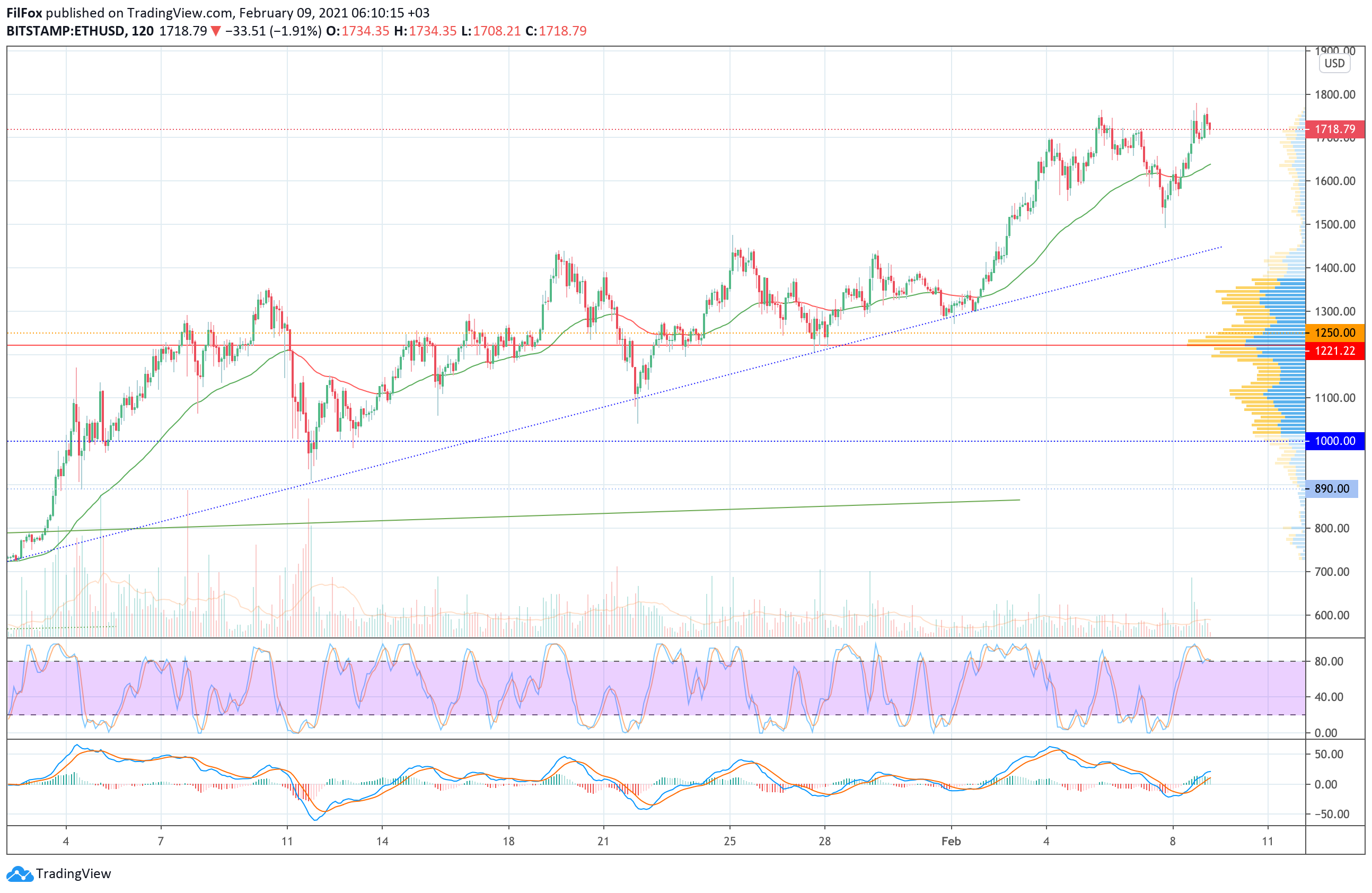 Вечером пара смогла обновить абсолютный максимум, который был установлен на прошлой неделе, вплотную приблизившись к отметке 1780.00 USD. В завершении дня объёмы торгов сократились, и цена откатилась к поддержке 1700.00 USD.
