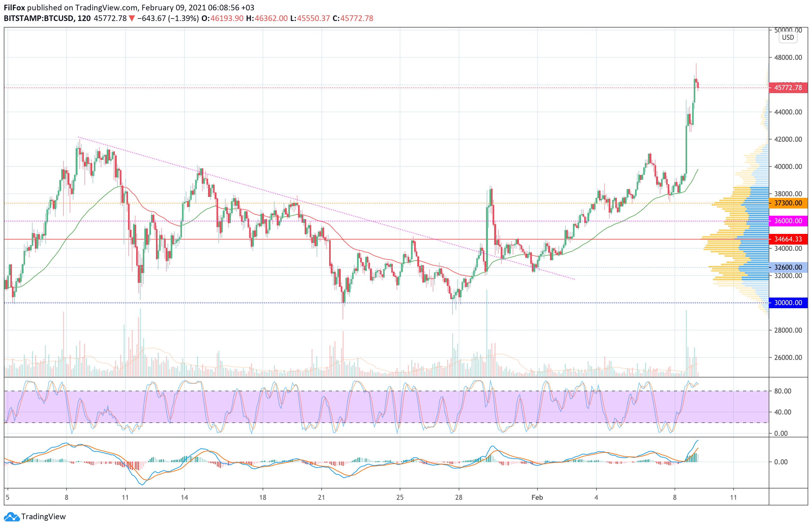 Вчера утром покупатели смогли удержать цену Bitcoin выше уровня средних цен, а во второй половине дня им удалось сформировать мощный бычий импульс, который преодолел зону январских максимумов, и пара установила новый абсолютный рекорд в районе отметки 47565.00 USD.