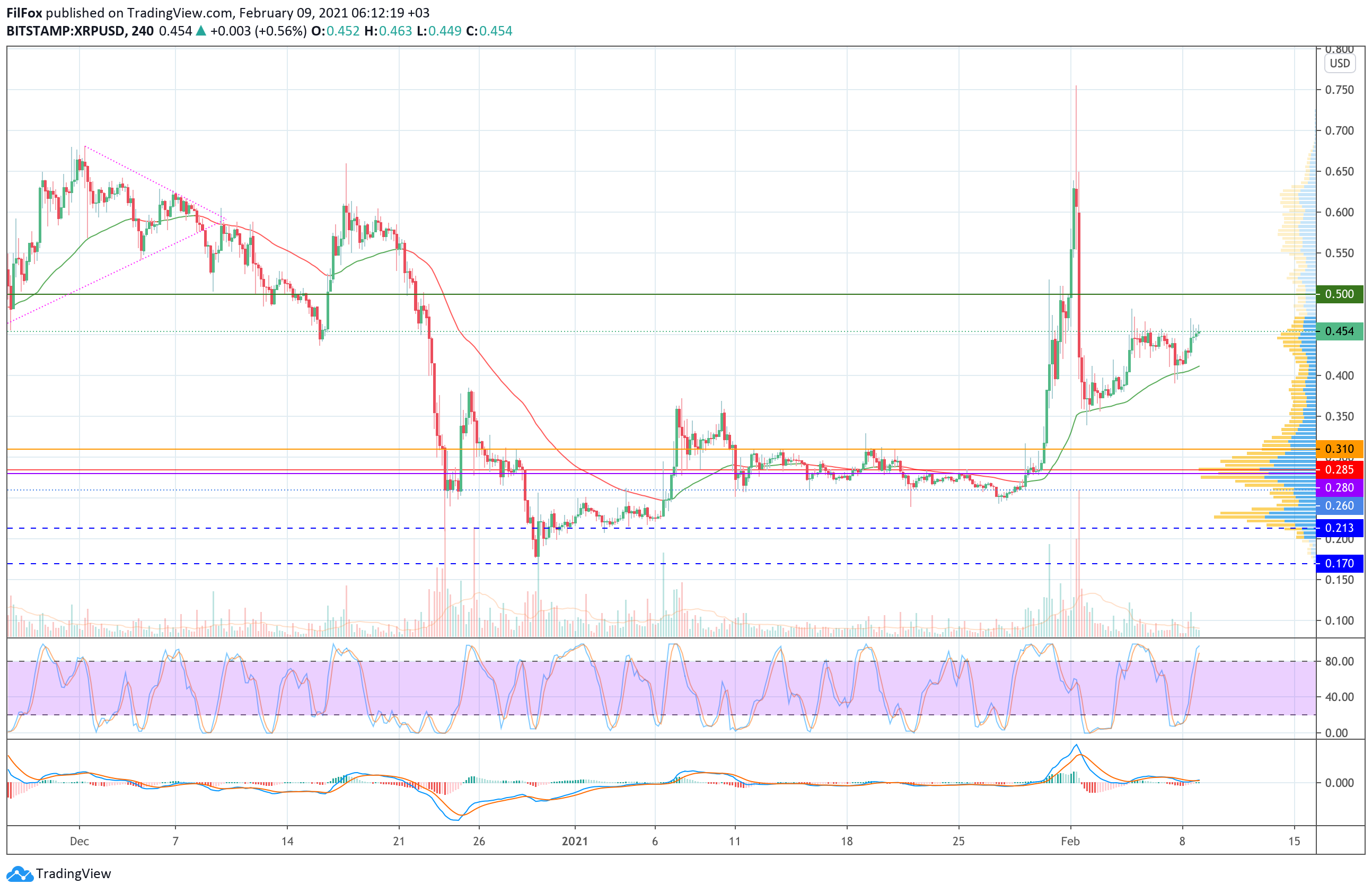 Вчера покупатели попытались восстановить пару в боковой диапазон, в котором цена Ripple находилась в конце прошлой недели. В результате пара смогла протестировать верхнюю границу этого диапазона 0.450 USD, а прочность этого уровня сопротивления задержала прорыв к психологической отметке 0.500 USD.