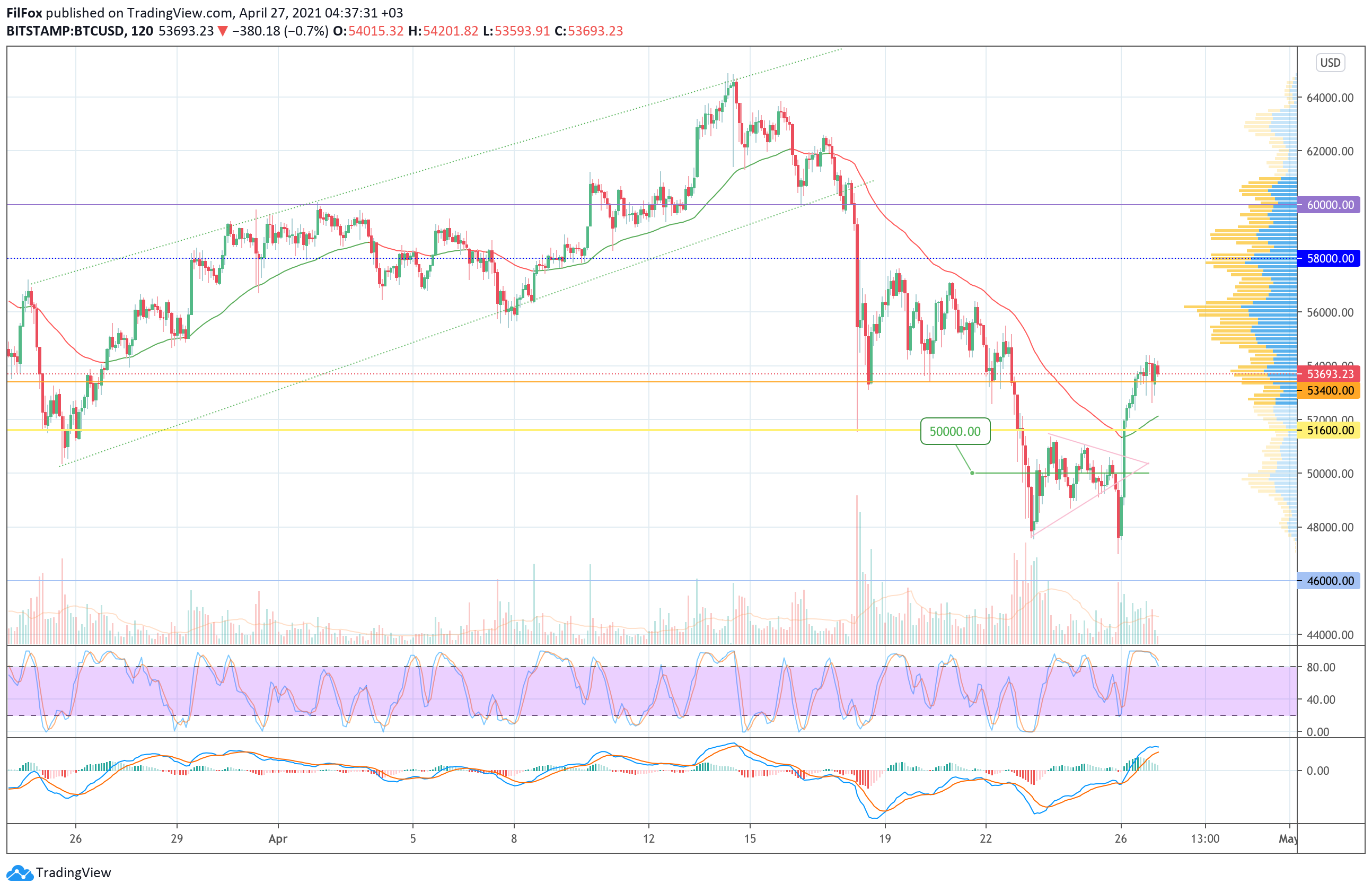Вчера восстановление цены BTC продолжилось выше отметки 53400.00 USD. Сегодня ночью продавцам несколько раз удавалось проколоть эту поддержку, но до утра пара удержалась выше оранжевого уровня.