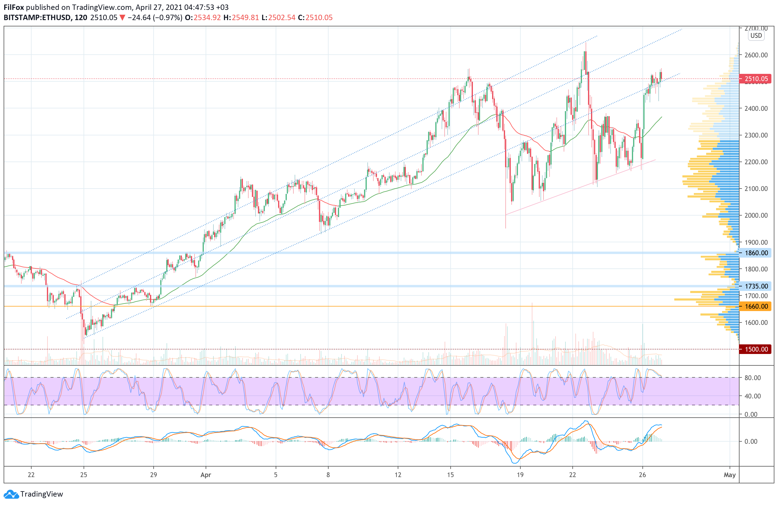 Во второй половине дня покупателям удалось прорваться выше линии тренда, но до конца дня цена эфира находилась под постоянным медвежьим прессингом, который вытеснял пару из восходящего канала в область средних цен.