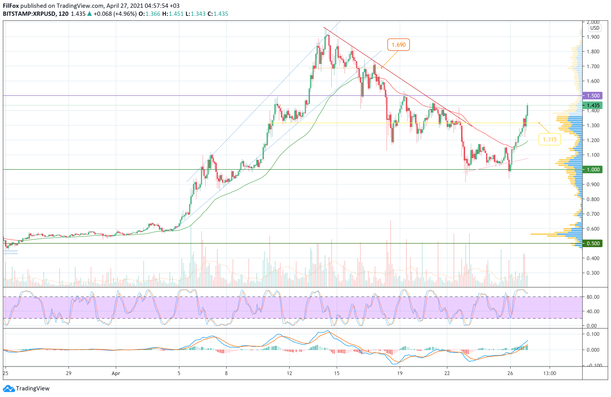 Вчера утром покупателям удалось прорвать сопротивление двухчасовой EMA55 и продолжить восстановление пары выше отметки 1.315 USD. В завершении дня медведи попытались вернуть пару в область средних цен, но сегодня ночью рост продолжился, и на утро цена XRP обозначила локальный максимум в точке 1.465 USD.