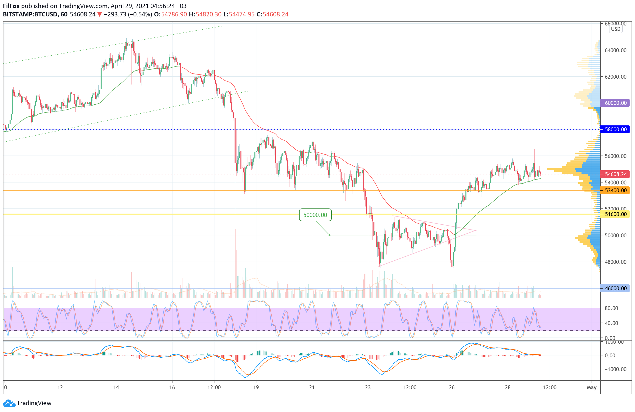 Вчера утром пара откатилась в область средних цен, а в течение дня пыталась восстановиться к сопротивлению 56000.00 USD. До конца дня покупателям всё-таки удалось протестировать этот уровень, но активность продавцов вернула цену BTC к часовой EMA55.
