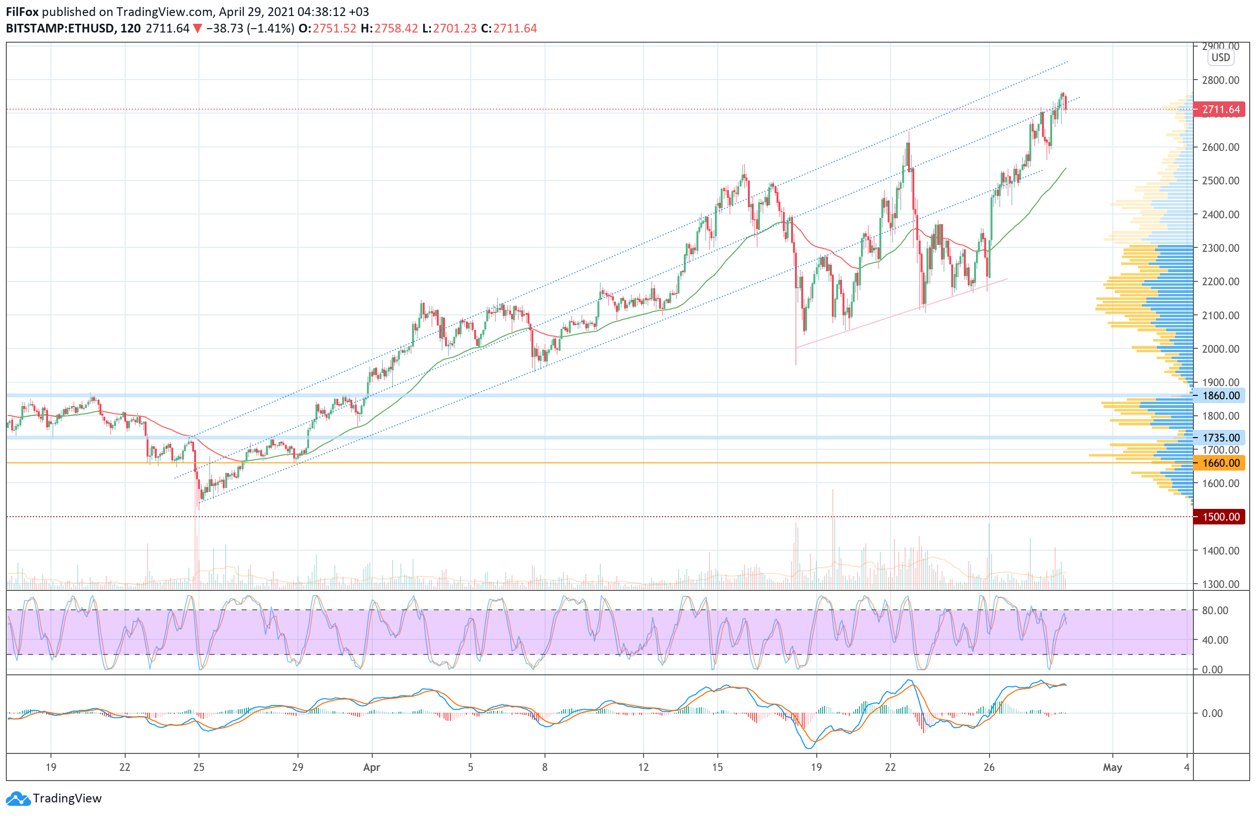 Вчера в первой половине дня цена Ethereum откатилась к поддержке 2600.00 USD. Несмотря на попытку медведей проколоть этот уровень, пара смогла удержаться над ним и до конца дня восстановилась выше средней линии восходящего канала.