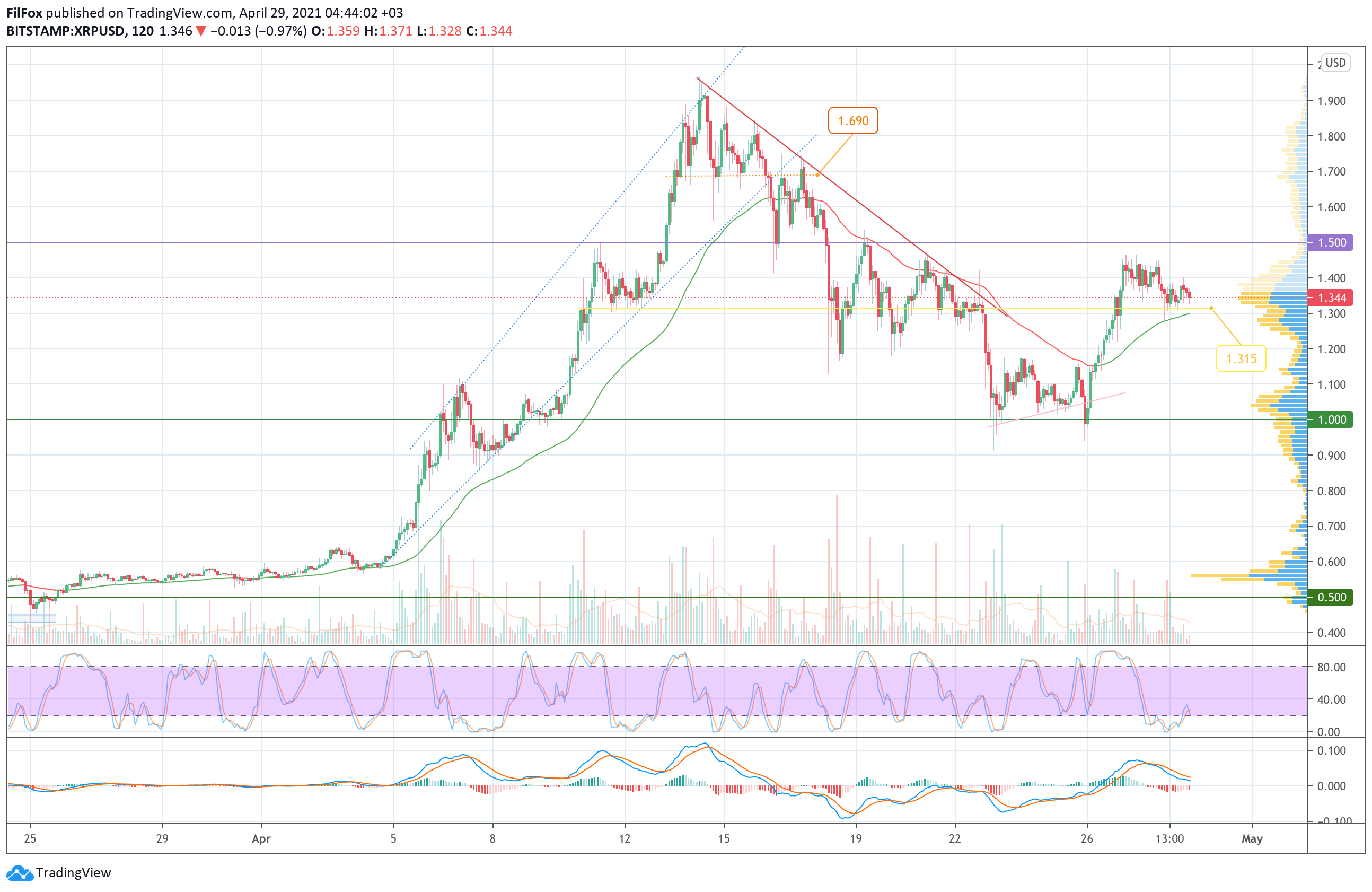 Вчера утром продавцы оттеснили цену XRP в область средних цен, но желтая поддержка 1.315 USD смогла удержать пару в консолидации.