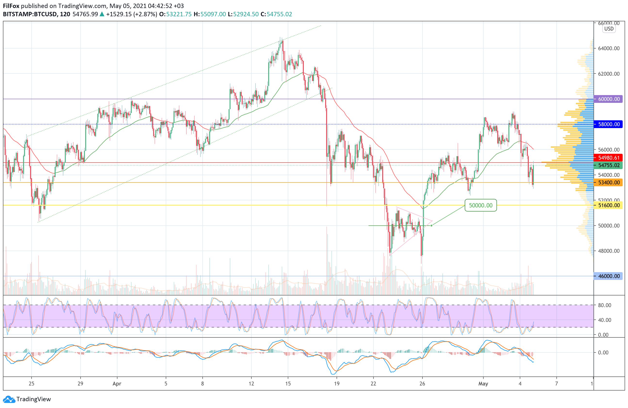 Вчера утром цена BTC не смогла пробиться выше двухчасовой EMA55. Во второй половине дня падение продолжилось к оранжевой поддержке 53400.00 USD. В итоге пара установила локальный минимум в районе отметки 52925.00 USD и за минувшую ночь попыталась восстановиться.