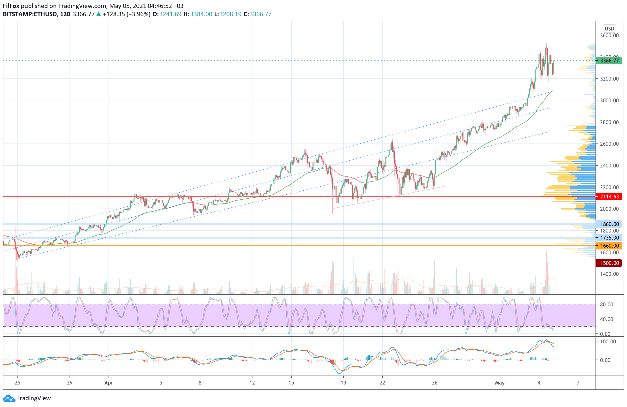 Цена Ethereum обновила максимум в точке 3530.00 USD. Рынок в зоне перекупленности. Во второй половине текущей недели возможен откат ниже уровня средних цен.