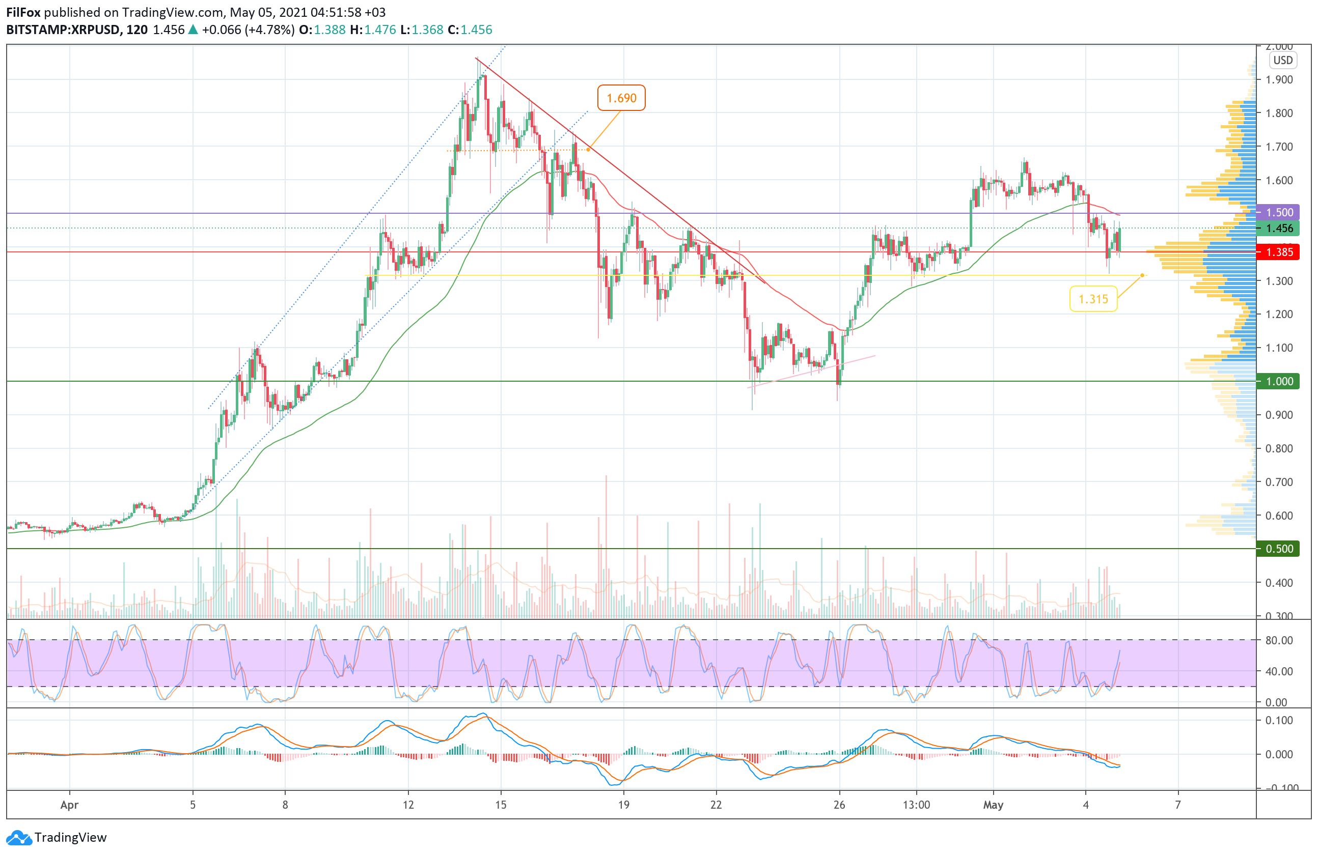 Вчера покупатели не справились с сопротивлением на уровне 1.500 USD и цена XRP продолжила откат к желтой поддержке 1.315 USD. Во второй половине дня этот уровень поддержки остановил снижение и пара пытается вернуться на прежний уровень, в область средних цен.