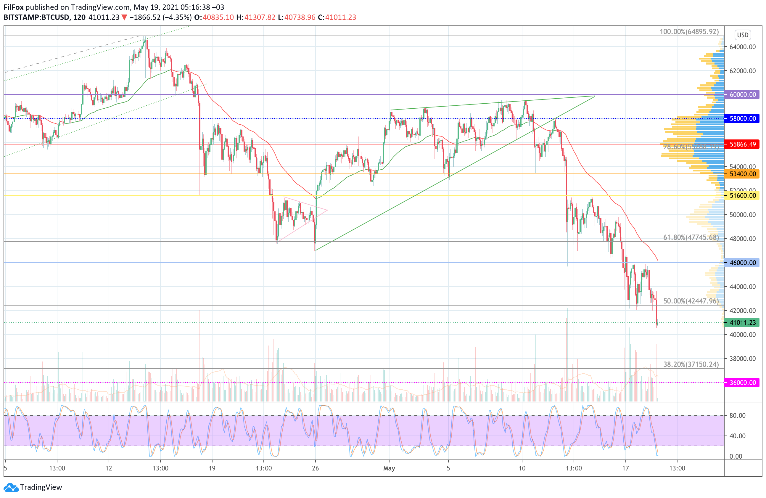 Между уровнями 50% фибо (42447.90 USD) и 38.2% фибо (37150.24) есть только слабая психологическая поддержка 40000.00 USD. Мы не думаем, что она сможет удержать цену Bitcoin от ре-теста очередного уровня фибоначчи.
