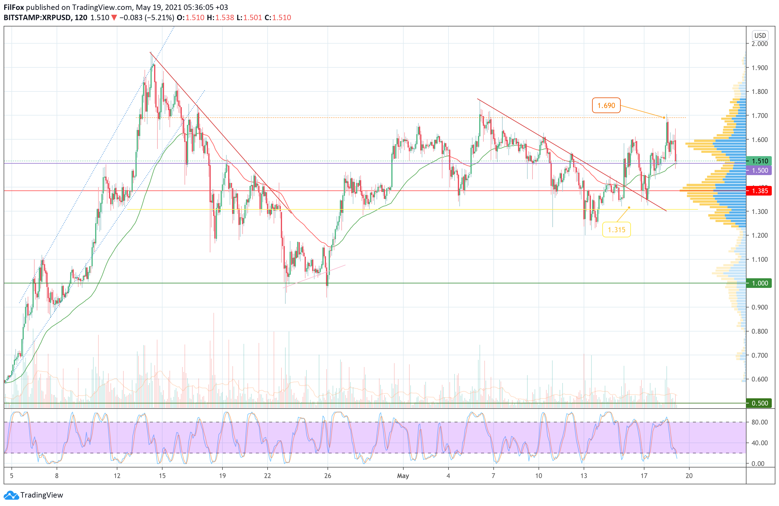 Вчера утром покупатели усилили натиск так, что в течение дня цена XRP смогла протестировать сопротивление 1.690 USD. Однако, преодолеть оранжевое сопротивление пара не смогла, и на сегодняшнее утро откатилась в область средних цен.