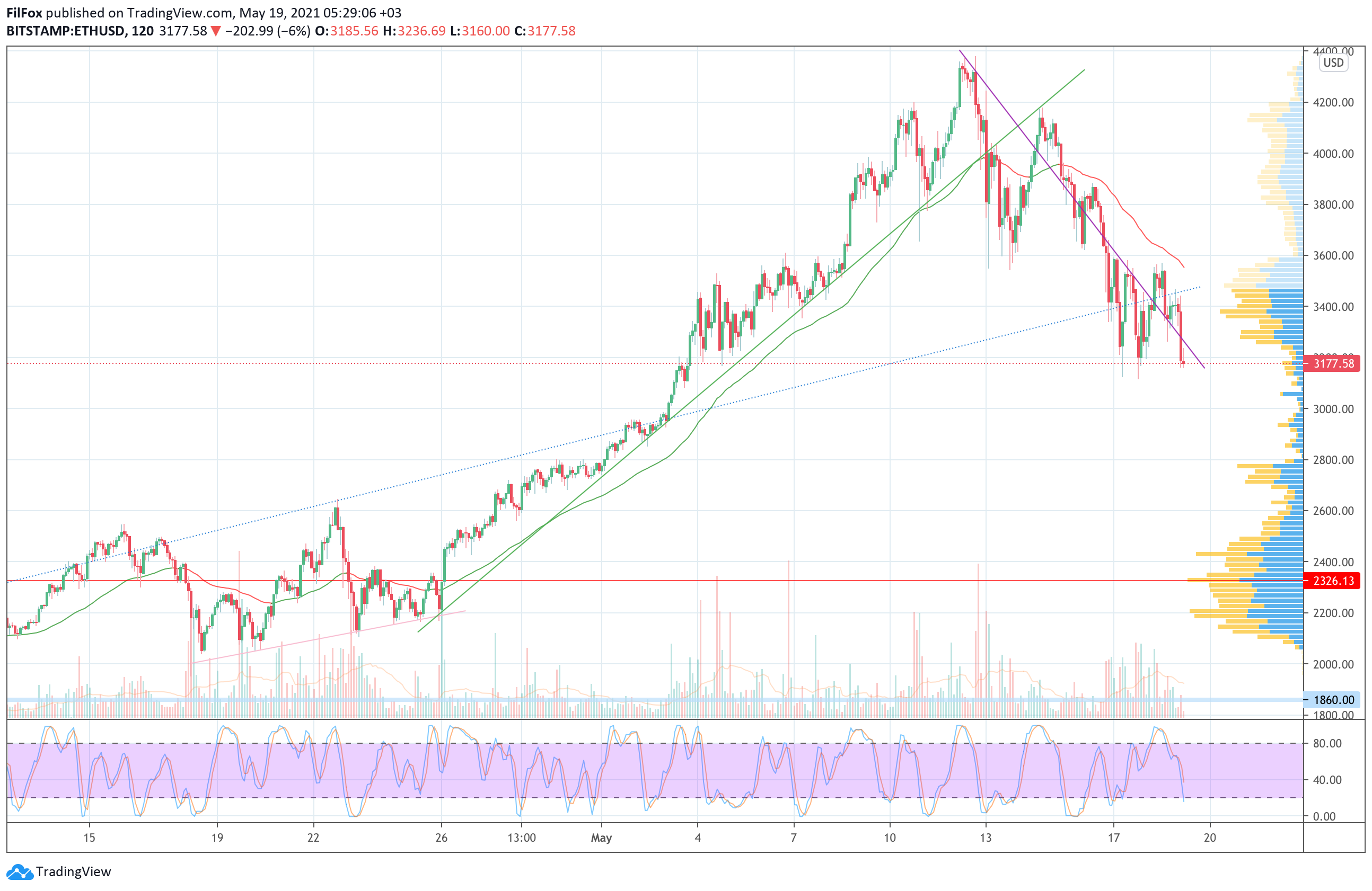 Вечером объёмы покупок сократились и цена Ethereum откатилась к фиолетовой линии даун-тренда. Казалось, что пара сможет удержаться выше нисходящей трендовой линии, но сегодня ночью медведи пробили эту поддержку и в течение дня цена протестирует психологический уровень 3000.00 USD.