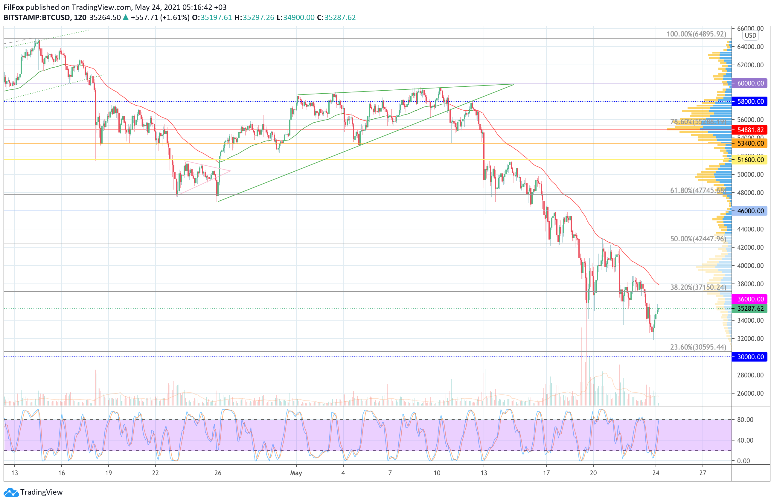Цена BTC протестировала уровень 23.6% фибо (30595.44 USD) и за ночь отскочила к сопротивлению 36000.00 USD. Если сегодня покупатели преодолеют сиреневый уровень сопротивления, то пара возвратится в узкий боковой коридор, в котором консолидировалась в эту субботу.