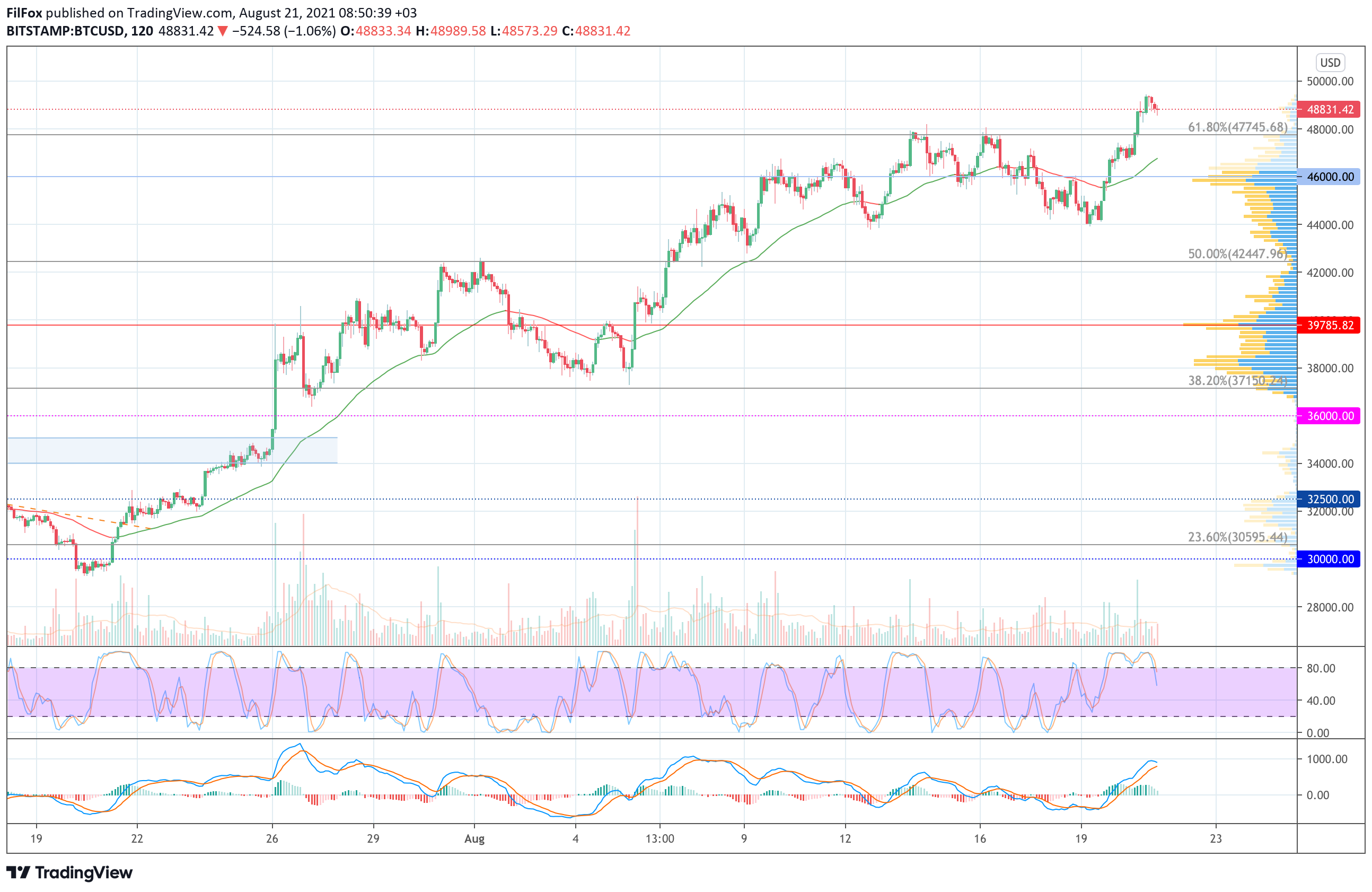 Вчера вечером цена биткоина пробила сопротивление 48000.00 USD, а сегодня ночью обновила трёхмесячный максимум в точке 49436.00 USD.