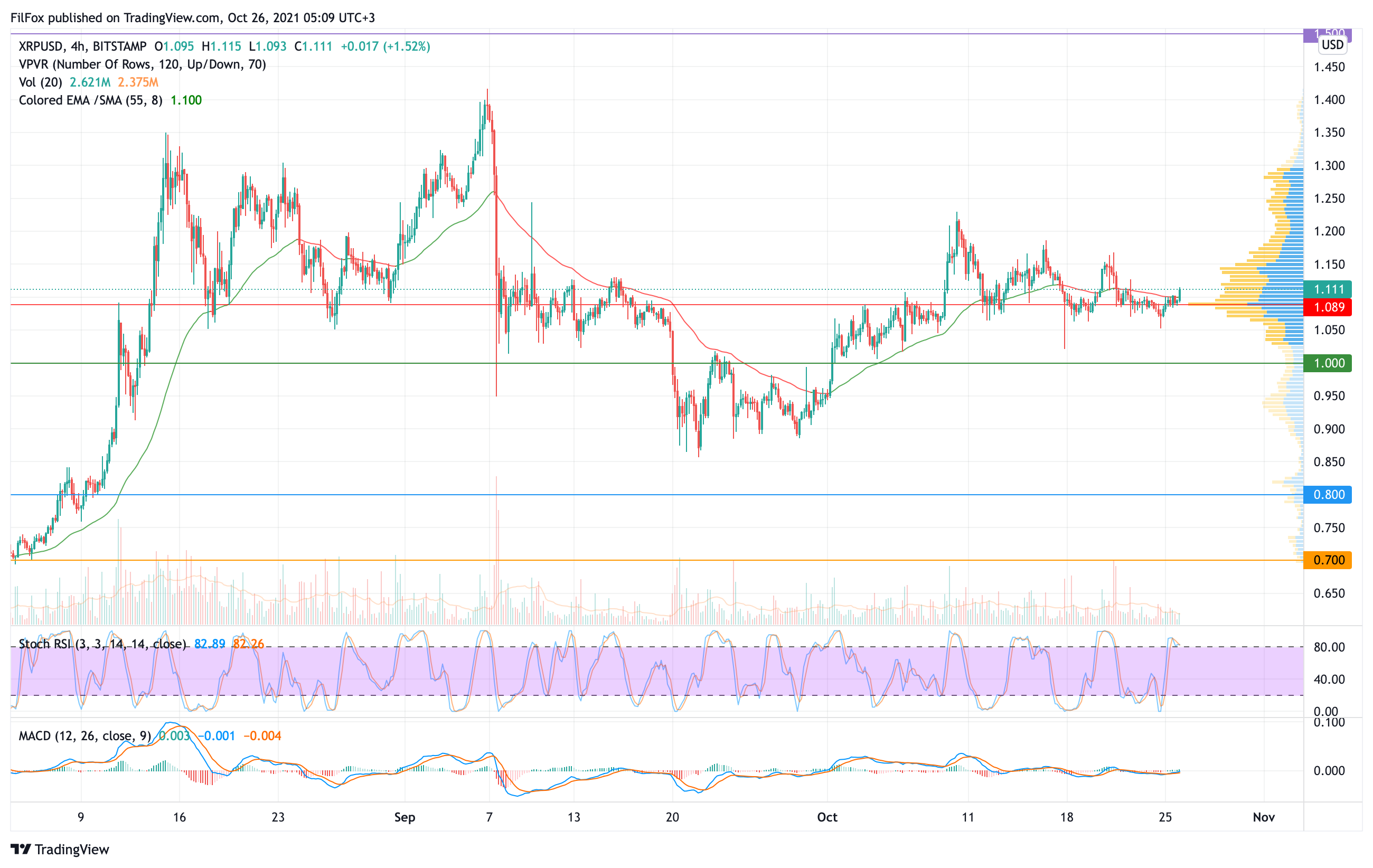 Вчера в течение всего дня цена XRP пыталась выйти за пределы верхней границы бокового диапазона. Только сегодня ночью покупателям удалось сформировать слабый импульс и прорваться выше четырёхчасовой скользящей средней EMA55, которая с прошлой недели удерживала пару в боковике.