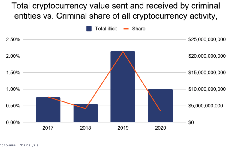 Однако по данным аналитической компании Chainalysis, использование цифровых активов в преступной деятельности идет на спад. Если в 2019 году криминальным структурам приписывали 2,1% от общего объема транзакций ($21,1 млрд), то в 2020 году показатель уменьшился до 0,34% ($10 млрд).